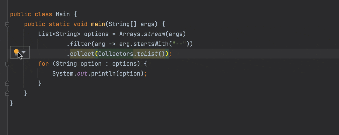 如果您使用的是 Java 16 和较新版本,您的 IDE 现在会提示您将 collect(toList()) 替换为 .toList(),,但仅限于没有人更改列表的情况。 这样,您的程序将保持正常运行,代码也将得到精简。