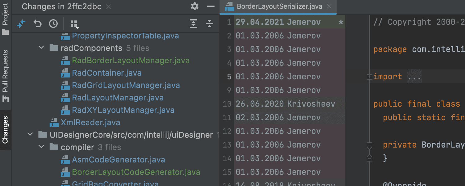以前,IDE 会在对话框中显示提交数据或提交之间的差异。 从此 EAP 开始,IntelliJ IDEA 将在位于编辑器左侧的独立 Changes 工具窗口中显示信息。