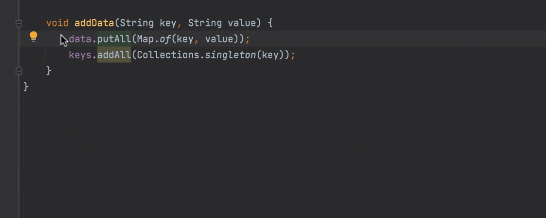 另一项检查可以帮助您简化代码,将 collection.addAll(List.of(“x”)) 替换为 collection.add(x)、将 map.putAll(Map.of(“a”, “b”)) 替换为 map.put(“a”, “b”)。