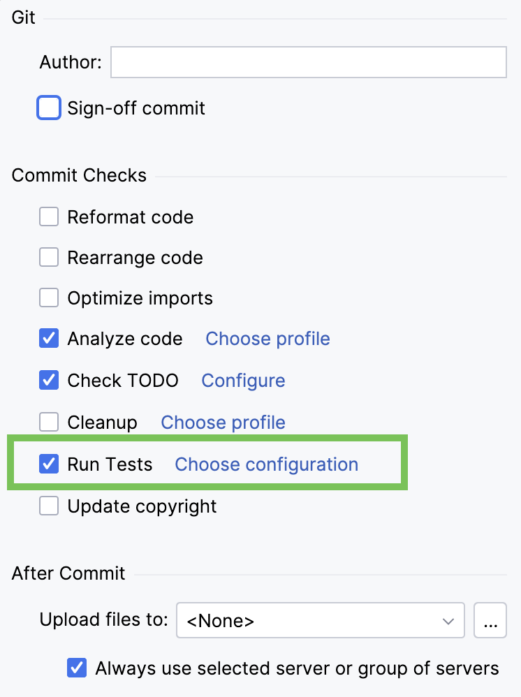 在“提交检查”菜单下的“运行测试”选项旁边,单击“选择配置”,然后选择要运行的配置。例如,这可以是生成工具提供的测试配置,也可以是项目中的单个测试类。gradle test