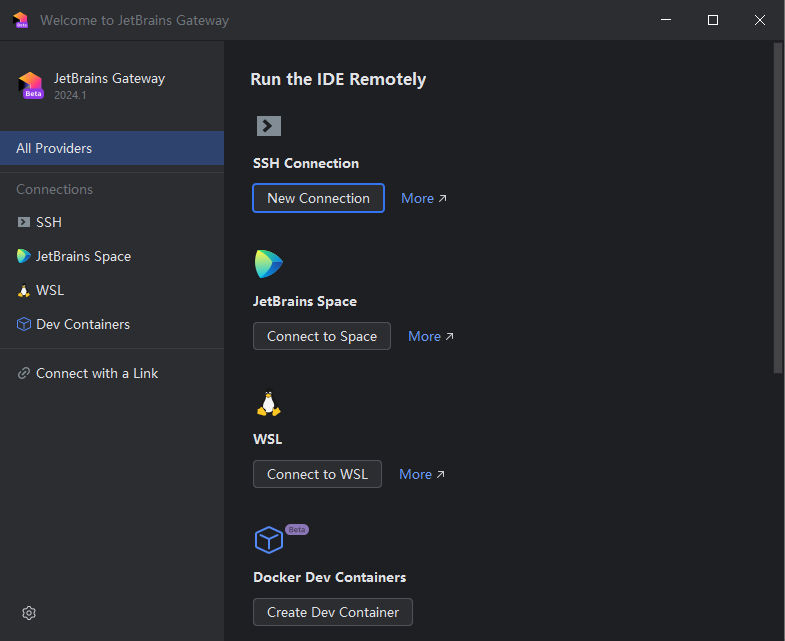 1、从 JetBrains Gateway 桌面应用程序启用远程开发工作流程。