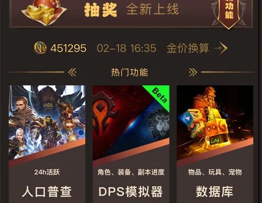 大脚小程序提供众多游戏辅助功能,人口普查、数据库、角色绑定、DPS模拟、BiS毕业装、坐骑、资讯、抽奖、福利、账号交易等。