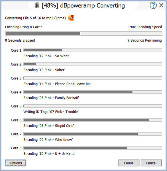 现代计算机具有多个内核,一个4内核系统实际上是4台计算机合二为一,dBpoweramp可以将mp3编码的速度提高四倍。有一个8核CPU ?,编码到mp3的速度将快8倍。在转换时动态添加和删除核心。
