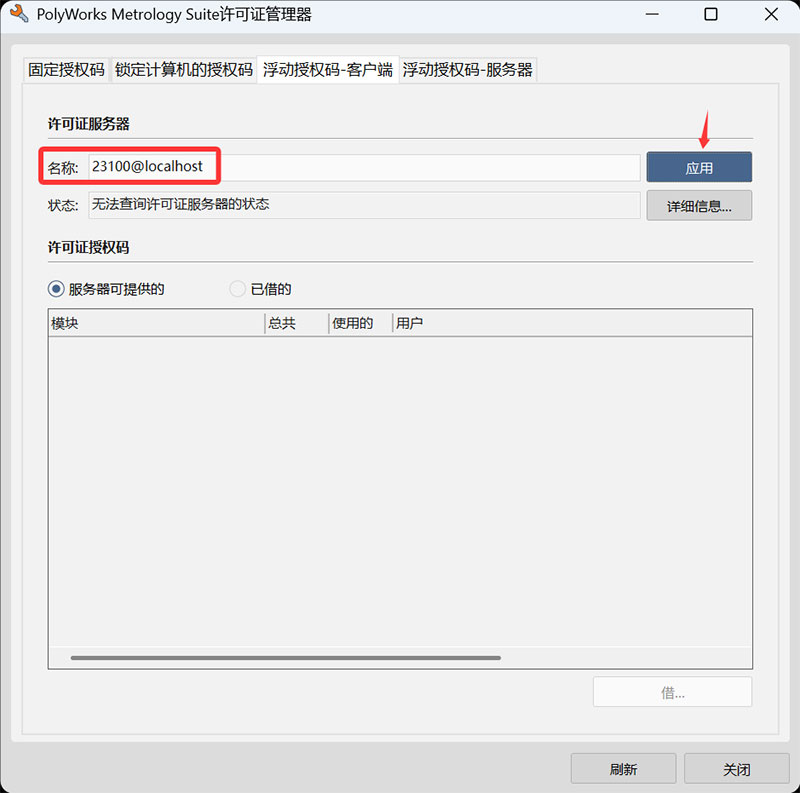7、我们先切换至“浮动授权码-客户端”选项卡,输入23100@localhost,点击“应用”;