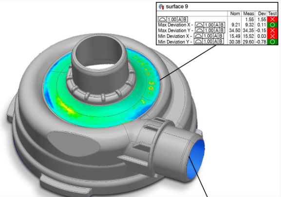 分析与GD&T相关的偏差值及其位置,以诊断和修复制造问题或监控统计趋势。GD&T位置度和轮廓度的派生尺寸可即时报告描述实际测量偏差的数值,并在基准参考框对齐下呈现,而无需创建附加特征或对齐数据。其中包括: