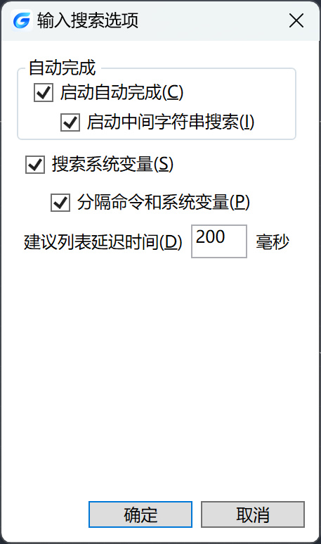 启用中间字符串搜索:仅当“自动完成”处于打开状态时可用,建议以键入的字母开头或包含这些字母的命令和系统变量。