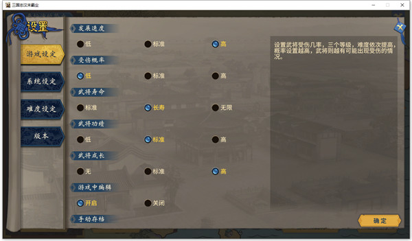 7、选择其中一种你想要扮演的势力后,设置好自己的游戏设定,比如发展速度、受伤概率、武将成长、武将功绩、武将成长等参数即可开始游戏。