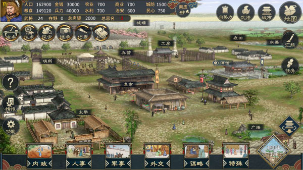 政务是策略游戏势力发展的基础,建议早期只对最重要的商业【决定金钱收入】,农业【决定粮食收入】,治安【决定城市治安度,低了容易暴动!】这三项进行投入,安排武将的能力顺序也是商业,农业,治安优先,同时量力而行,用默认的最低档投资额,这个档次的投入产出性价比是最高的。早期金钱就捉襟见肘,全面开花或者拉到中高档位投入都有浪费金钱之嫌,性价比低。因为早期玩家少有治水能力和建筑能力80以上的武将,能力过低不建议进行投放。