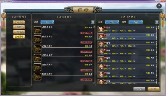 任命中分为4个部分【任命太守】这是更换自己城池太守的方法,玩家可自行选择一个有能力的太守。任命太守时,建议玩家选取能力高,野心低的武将,随时注意太守的忠诚度,以防太守反叛。【任命重臣】即为在主城任命三个大臣,提高主城的政务发展效率,属性越好效率越高。重臣只对主城有效果,分城就是以太守的属性为主。太守的政务属性越好,效率越高。【任命官职】是一个提高武将忠诚度的办法,通过高官厚禄来提高武将忠诚度。如果手动封官,可以根据武将低的属性来封,不同的官职加的属性不同,因人而异。【任命统领】在己方城市有特殊兵种的城市,在城市特性开启后,第二个月会获得一枚特殊兵虎符,任命给武将后,该武将就能统领该兵种出去战斗。建议任命给属性好的武将,在选择时也会比较方便。