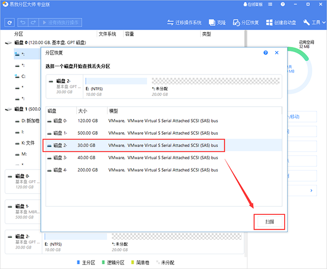 2、选择一个丢失了分区的磁盘,点击“扫描”。