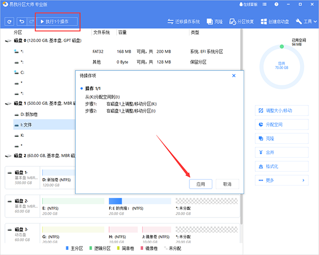 4、确认要执行该操作时,点击左上角“待执行操作”列表,选择“应用”即可完成操作。