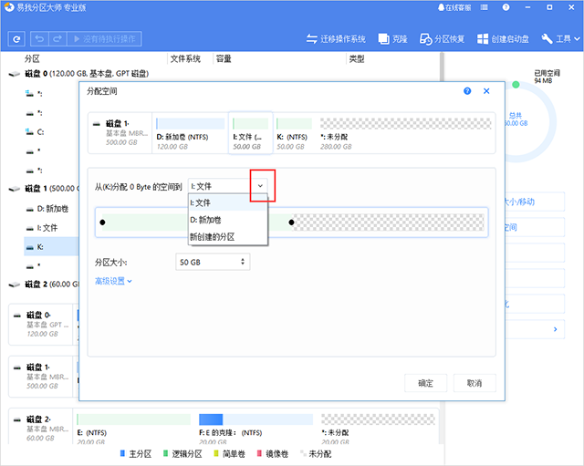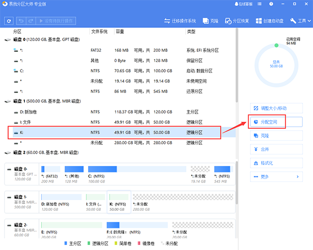 1、在磁盘上选择一个分区,然后从功能列表中点击“分配空间”。