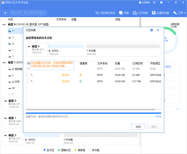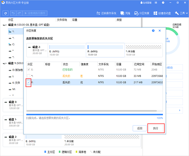 5、勾选所需的分区,然后点击“执行”进行恢复。