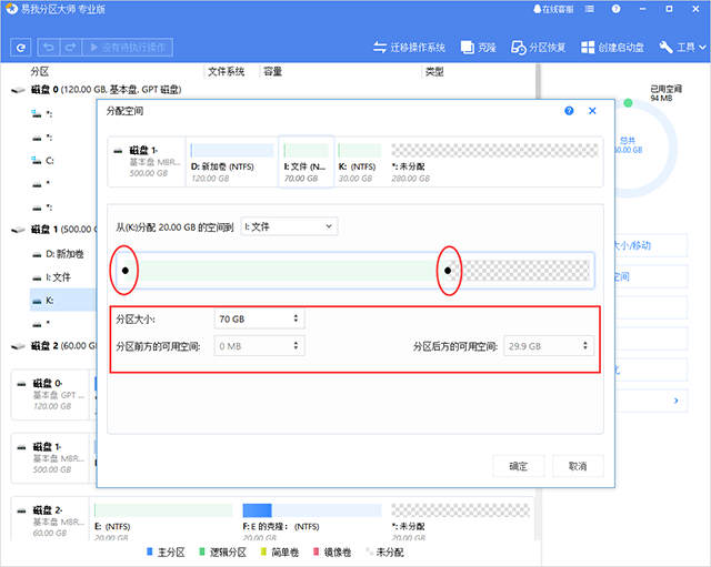 3、拖动分区两侧的黑色小圆点,或填写对话框中的“分区大小”、“分区前方的可用空间”、“分区后方的可用空间”以定义分区的大小和位置;选择完成后,点击确定。