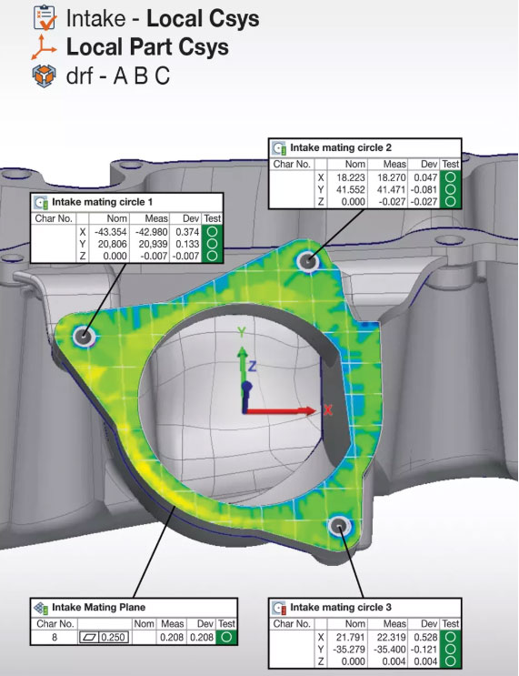 工作流程的核心 是提取零件尺寸并计算与其相应标称尺寸的偏差。由于集成到PolyWorks中的卓越灵活性,可以从测量点云,从点云构建的多边形模型或探测点提取尺寸。也可以从CAD模型或参考测量部件中提取标称尺寸。