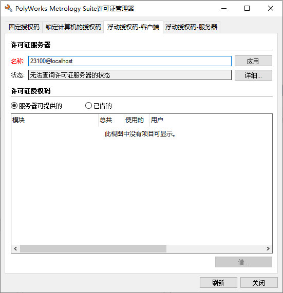 许可证服务器名称的输入:23100@localhost > 应用