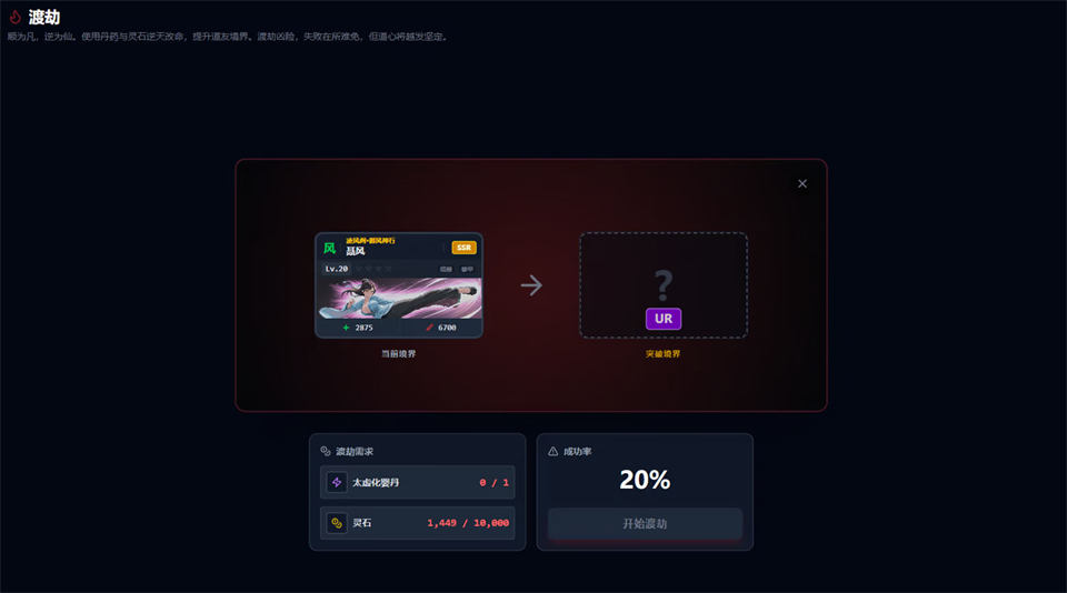 在该游戏中,即使是R级的普通角色,也能通过“渡劫”系统逆天改命,晋升为SSR甚至UR品质!