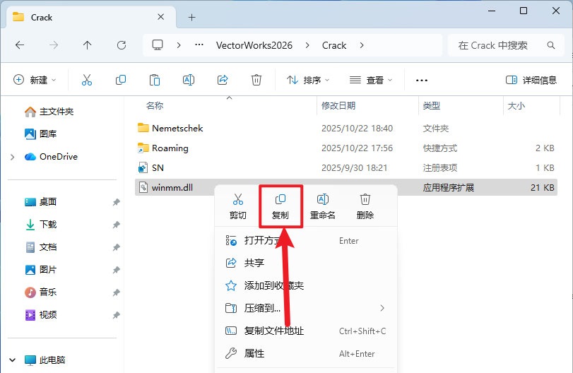 12、打开【Crack】文件夹,鼠标右击【winmm.dll】选择【复制】。