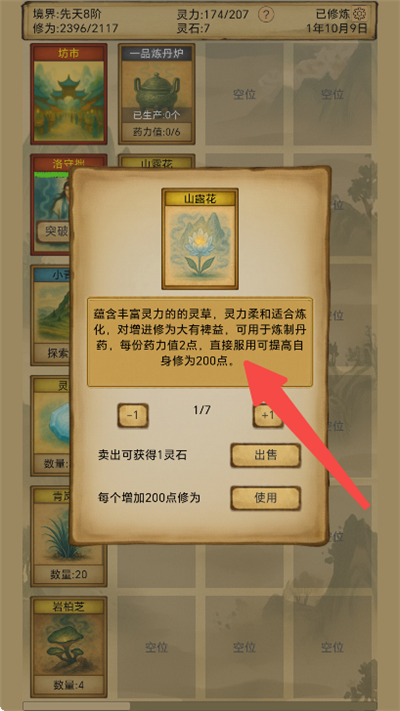 1、使用山露花可提高自身修为200。
