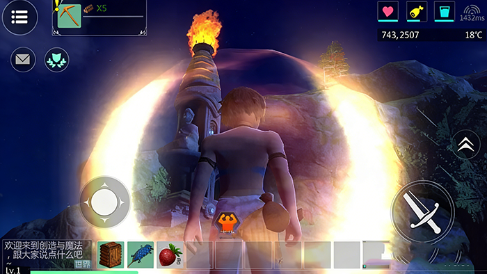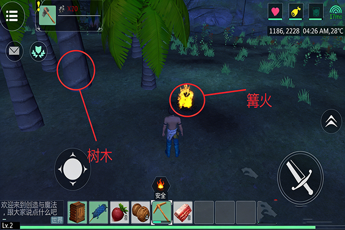 1、为了躲避小怪,你也需要尽快准备篝火,在火源附近小怪是无法靠近的,这能够保证你的安全,并且篝火能够制作熟肉,熟肉是非常棒的食物。在游戏里面篝火是通过石块和木头合成的,你可以点击游戏感叹号按钮进入制作从而找到篝火的合成,石块在游戏内很多,你很容易就能够找到,但是你可能会发现你徒手敲打石头的速度实在是太慢了,我建议你先徒手砍树合成木稿后用木稿去敲打石头,速度会快很多,木稿需要通过木头合成,木头通过砍树得到,一两棵树就能提供木稿所需要的木头了。