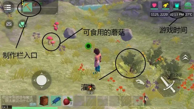 2、如果此时游戏还远远未到小怪刷新的时间,你可以边欣赏一下游戏的风景,边采集一下路上的灌草,从这些灌草中你可以采集到较多的水果或者植物纤维,植物纤维是为了以后的麻布做准备,而水果则可以给你带来食物和水分,在前期灌草是相当重要的资源。