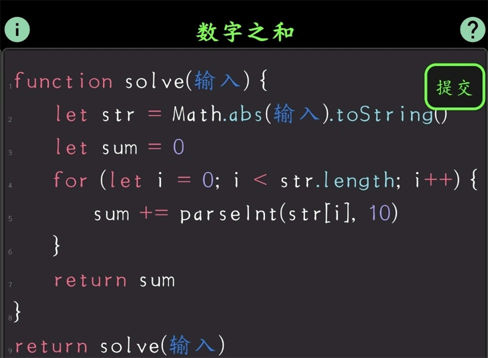 3)遍历累加:循环字符串的每个字符,用 parseInt() 转回数字并累加