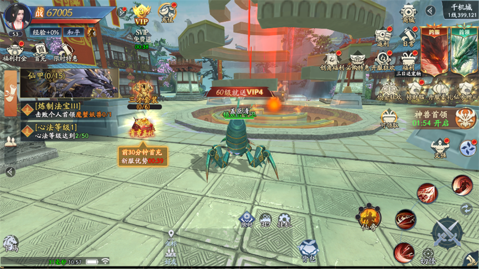 这款游戏的福利非常丰富。登录即送十大豪礼,包括精美套装和珍惜外观;在线免费激活升仙令,领取VIP特权;首充礼包更是包含3天豪礼;升级到40级还能获得永久SVIP特权。此外,还有7日签到活动,玩家可以每天领取奖励,比如宠物、坐骑等。