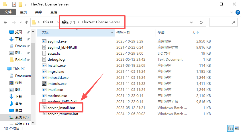 18、双击运行C盘【FlexNet_License_Server】文件夹下的【server_install.bat】程序文件。