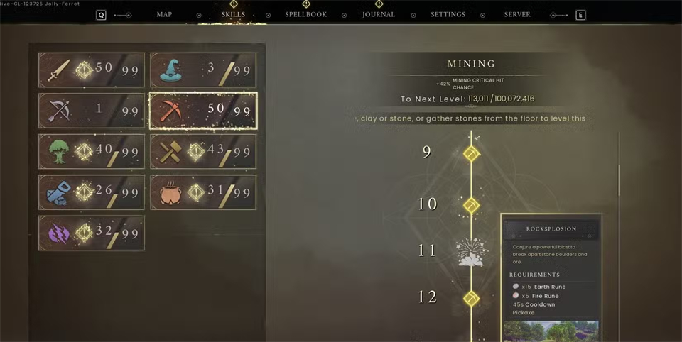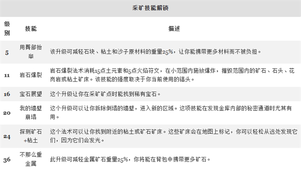 每次你升级采矿技能,在采矿过程中命中暴击的几率增加1%。暴击会对你正在采矿的目标造成双倍伤害,让你更快地收集矿石。采矿技能树也会在你开采粘土、石头或花岗岩矿床时升级。