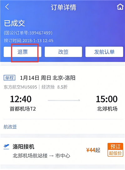 3、在“我的订单”页面,选择“机票”,则显示本账户下所有机票订单,点击需要退订的机票,进去机票详情页面。