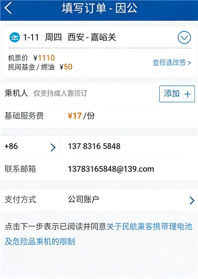 6、点击“添加”图标,选择乘机人,点击“提交”图标,进入订单确认页面;注意事项:手机号和联系邮箱,可以选择默认,也可以填写为其它号码;支付方式默认为“公司账户”,不需更改。订单一经确认,则无法更改,五分钟内订票成功,携程将给预留手机和邮箱发送机票订单信息。