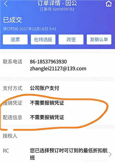 7、进入“订单详情-因公”页面,可以进行退票、在线选座、改签和发确认单操作。报销凭证默认为“不需要报销凭证”,配送信息默认为“不需要报销凭证”,均不需要更改。