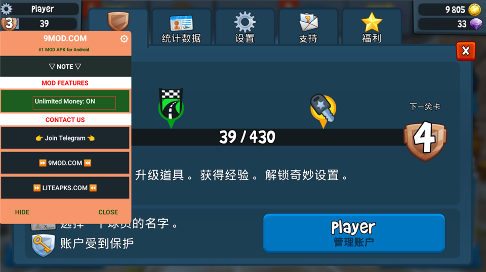 不过游戏里资源有限,还好有破解版可以无限金币和钻石宝箱。开启无限金币很简单:进游戏点左上角弹窗把“Unlimited Money”打开,然后去商店买道具升级车子就行。虽然破解版能省不少钱,但玩的时候还是要小心别下载了病毒软件。