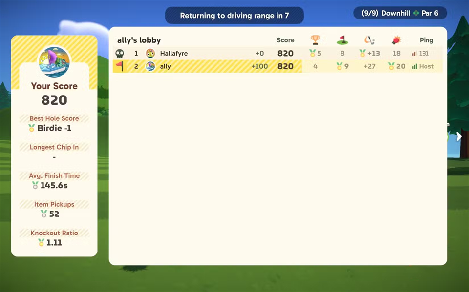 你在超级对战高尔夫中的得分来自多重渠道:以更少击球数完成球洞、率先完成球洞,以及对其他玩家造成伤害。