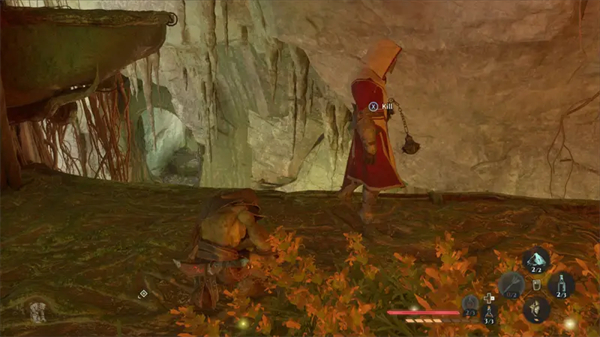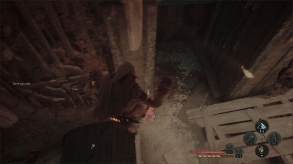 当然还有其他解决敌人的方式。若敌人正俯身观察悬崖,你可潜行至其身后“推落”。反之当你悬挂在另一侧崖壁时,若出现“杀死”提示,则可将其拖拽坠崖。