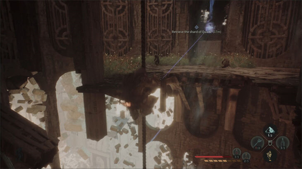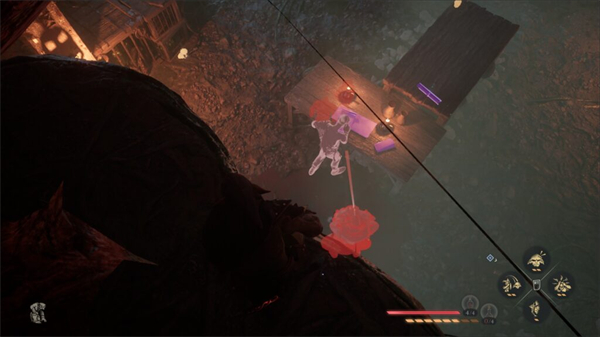 捡起它以获得10点经验,然后存档。回到你来的地方,使用琥珀视野,往下看。你能看到多条绳子通向下,我们要找的那座就在桥下。挂在绳子上,跳下来抓住绳子。