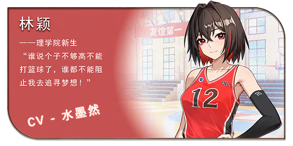 林颖是一位活泼的元气少女,对篮球十分的痴迷,可能也有家族遗传的关系,自己也希望成为一位篮球运动员。