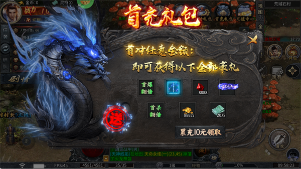 首充任意金额(累充10元即可领取),能直接拿到:首爆/首杀翻倍等核心资源,前期战力和刷怪效率直接起飞。