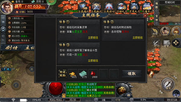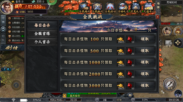 每日击杀100/500/1000/2000/3000只怪物,可领取海量资源,建议开启自动挂机刷怪,轻松完成目标。