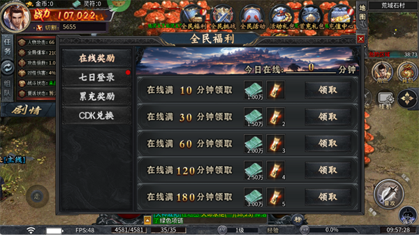 在线满10/30/60/120/180分钟等,分别领取大量材料和道具,全程挂机就能拿,是零氪党稳定资源来源。