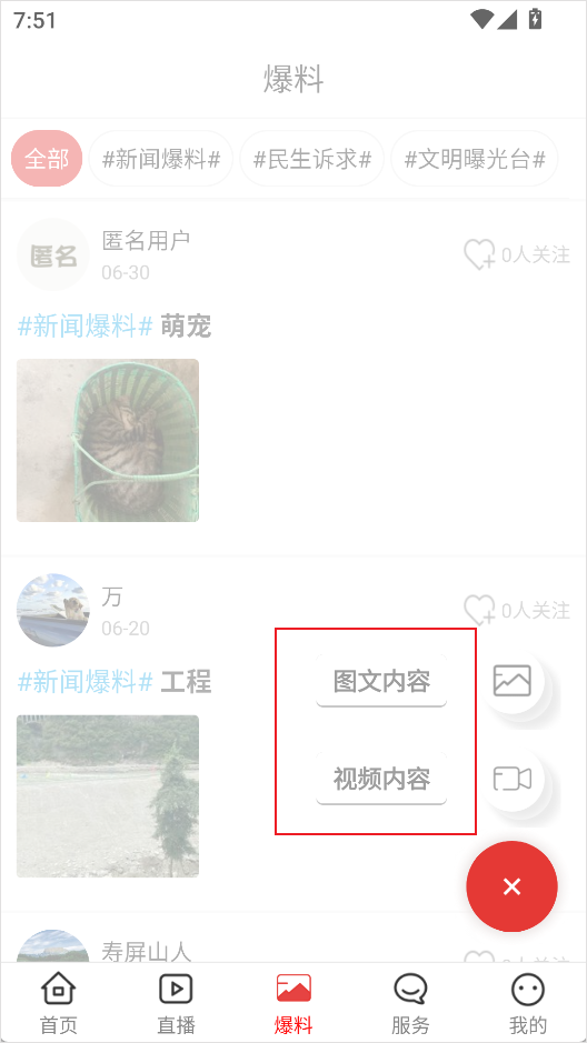 2、进入爆料页面后,点击右下角的【+】按钮开始发布内容;