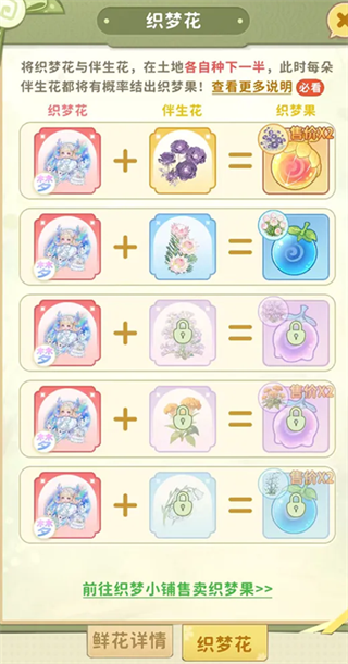 注:点击织梦花右上角的图标可查看对应的伴生花和织梦果。