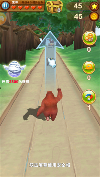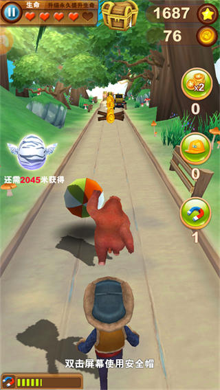 1.这款游戏和市面上的跑酷游戏玩法类似,主要是以躲避障碍获取高分为主,游戏中玩家要扮演熊大躲避光头强的追捕。