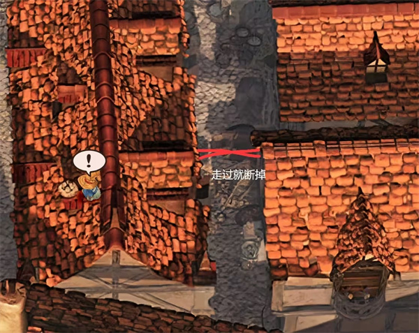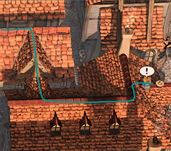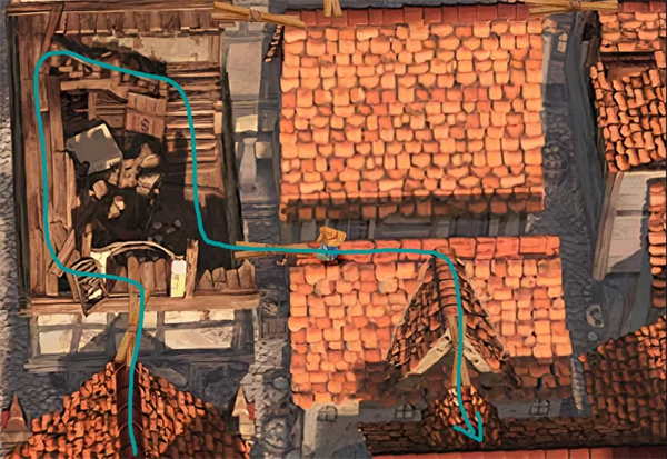 存完档爬上梯子继续主线,屋顶只能走尖顶处和木桥,白色鸟窝里可以捡到一些钱,由于路线复杂,直接图示: