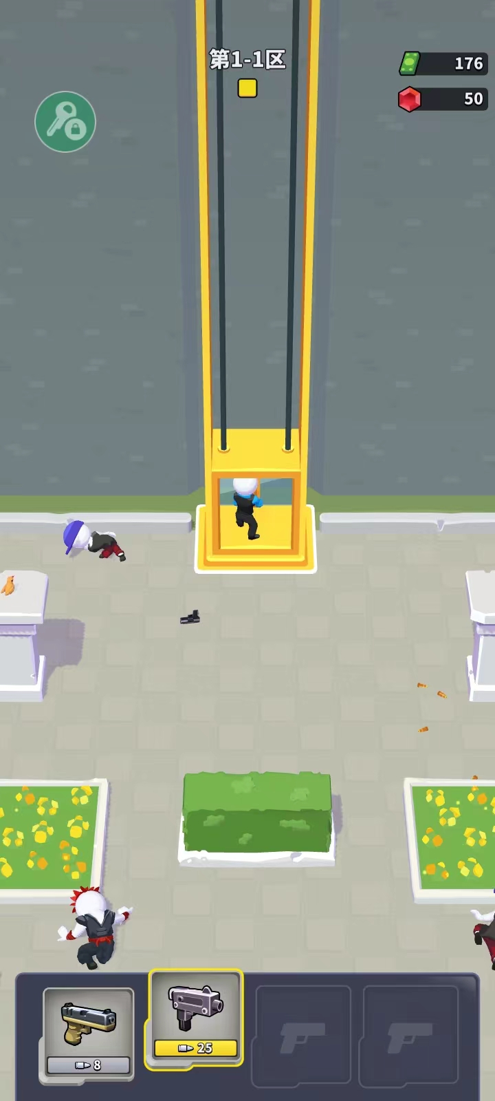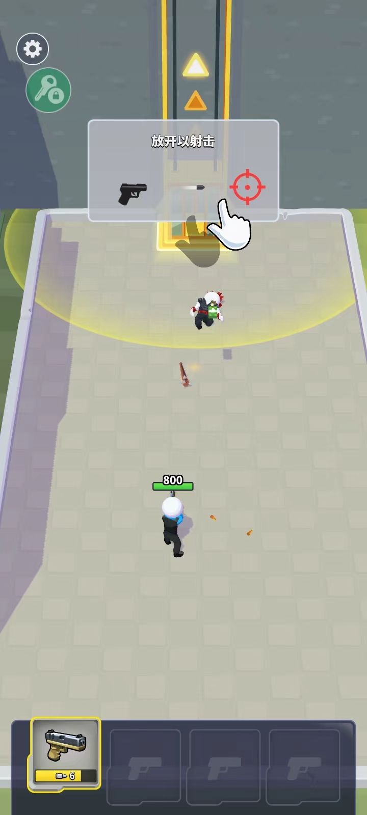 根据教程,刚开始玩会先体验游戏玩法,然后领取宝箱和现金奖励。正式游戏时可以切换武器,控制人物自动攻击进入虚线内的敌人。击败所有敌人后乘坐电梯通关,还能获得额外奖励。游戏特色包括竖版操作、多样的射击体验以及物理引擎带来的真实弹道计算。