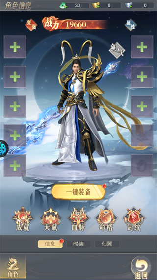 完成初始闯关后,进入角色信息界面,点击一键装备,系统会自动为角色穿戴已获得的装备,快速提升初始战力。