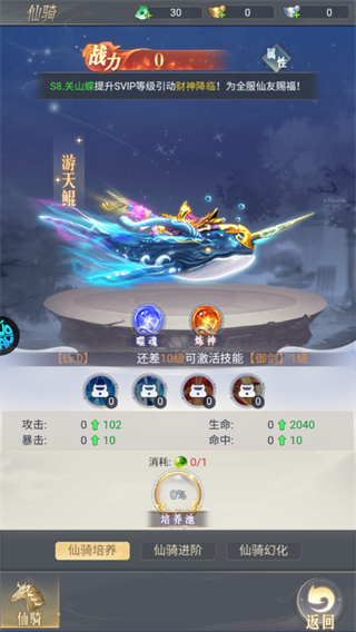 进入仙骑界面,查看初始仙骑游天鲲的属性,前期只需积累培养道具,无需消耗资源升级。