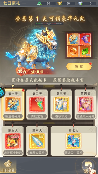 进入游戏后第一时间打开七日豪礼界面,点击“领取”获取第1天的豪华礼包,核心奖励为幽蓝兽碎片加成道具。