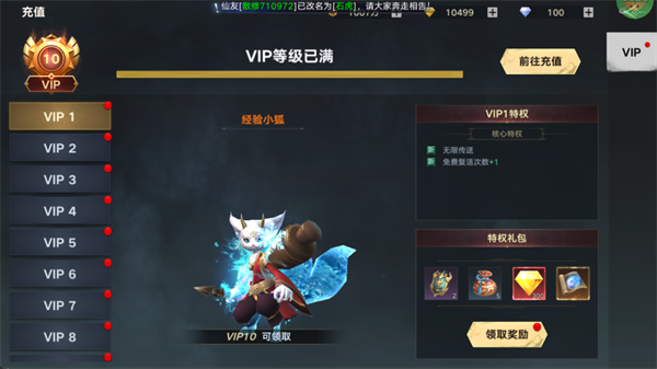 在VIP界面领取VIP10专属奖励“经验小狐”,并领取各等级VIP礼包,获取钻石、材料等资源。