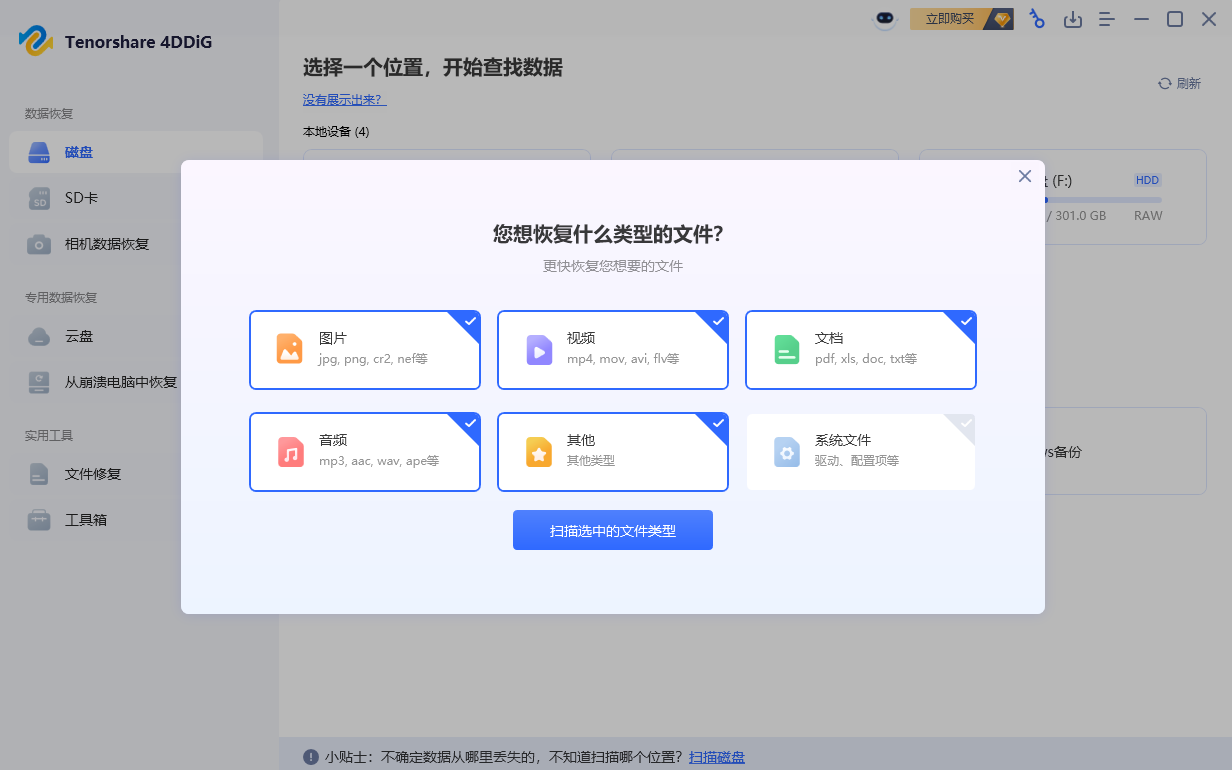 选择想恢复什么类型的文件,点击"扫描"并等待,扫描将很快完成。